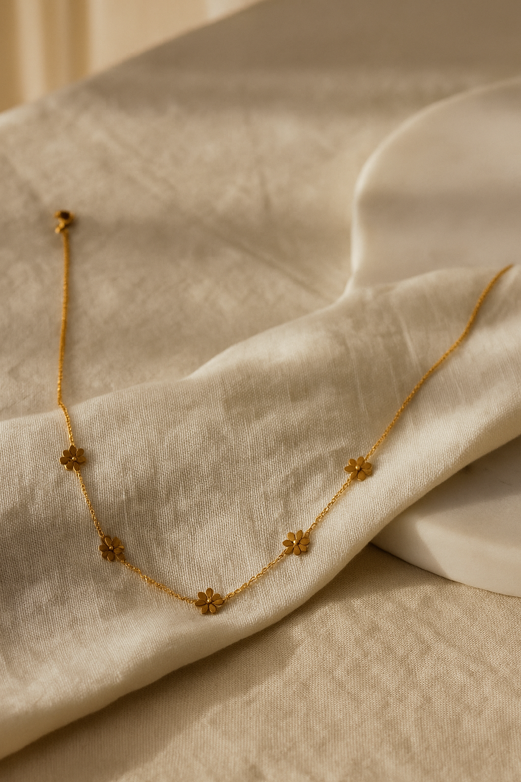 This is an exquisitely delicate chain necklace featuring a series of small, flat, polished gold flower (or clover) charms spaced evenly along the chain. The minimalist design focuses on subtle movement and a fine shimmer against the skin.