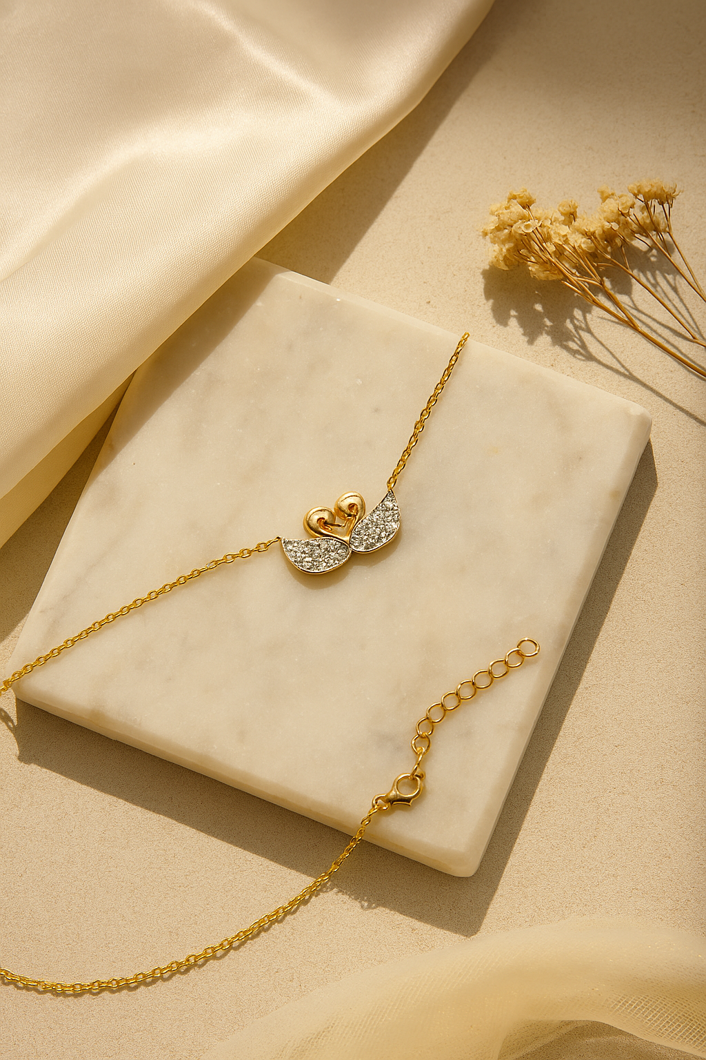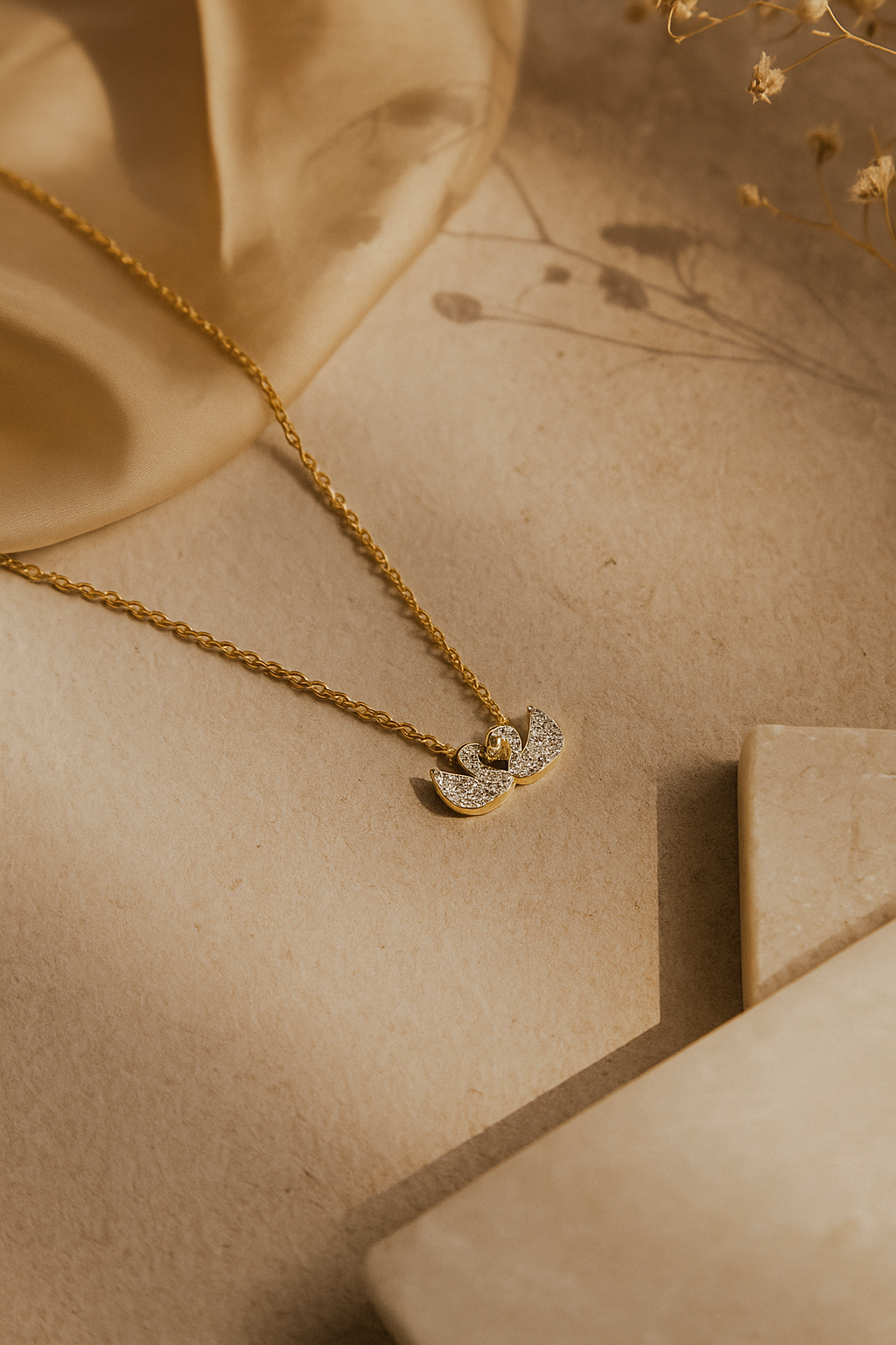 Graceful and refined, Amora features two elegant swans adorned with shimmering crystals, symbolizing love and harmony. Crafted with a sleek gold-tone finish and an adjustable chain, it’s the perfect piece for adding sophistication to any look.