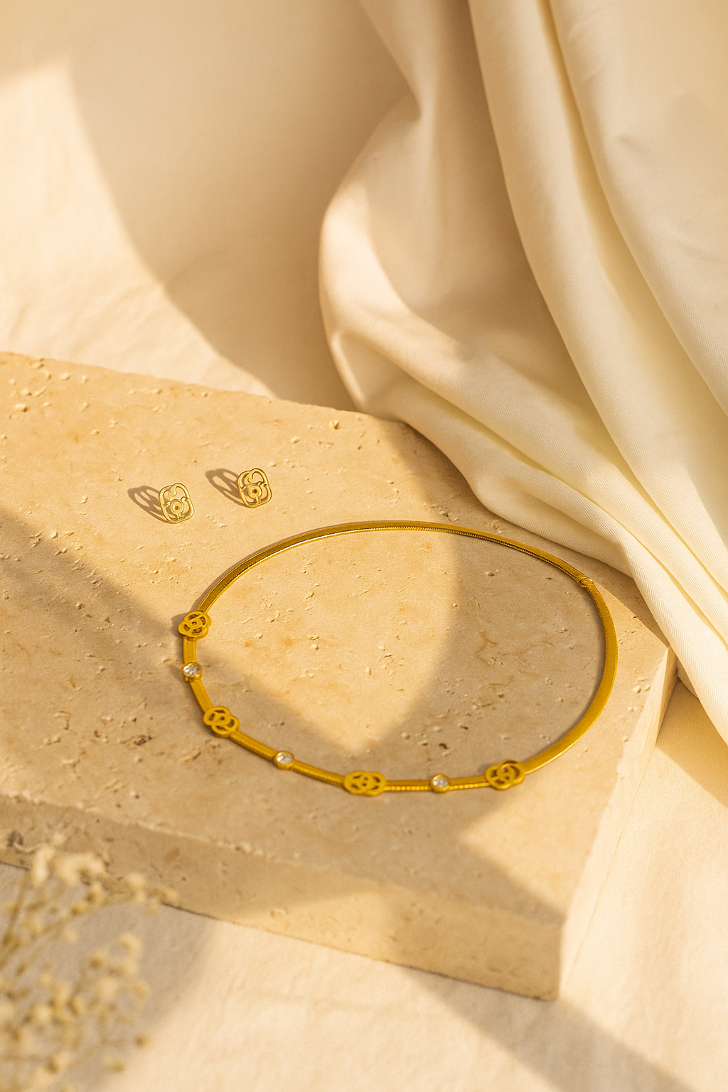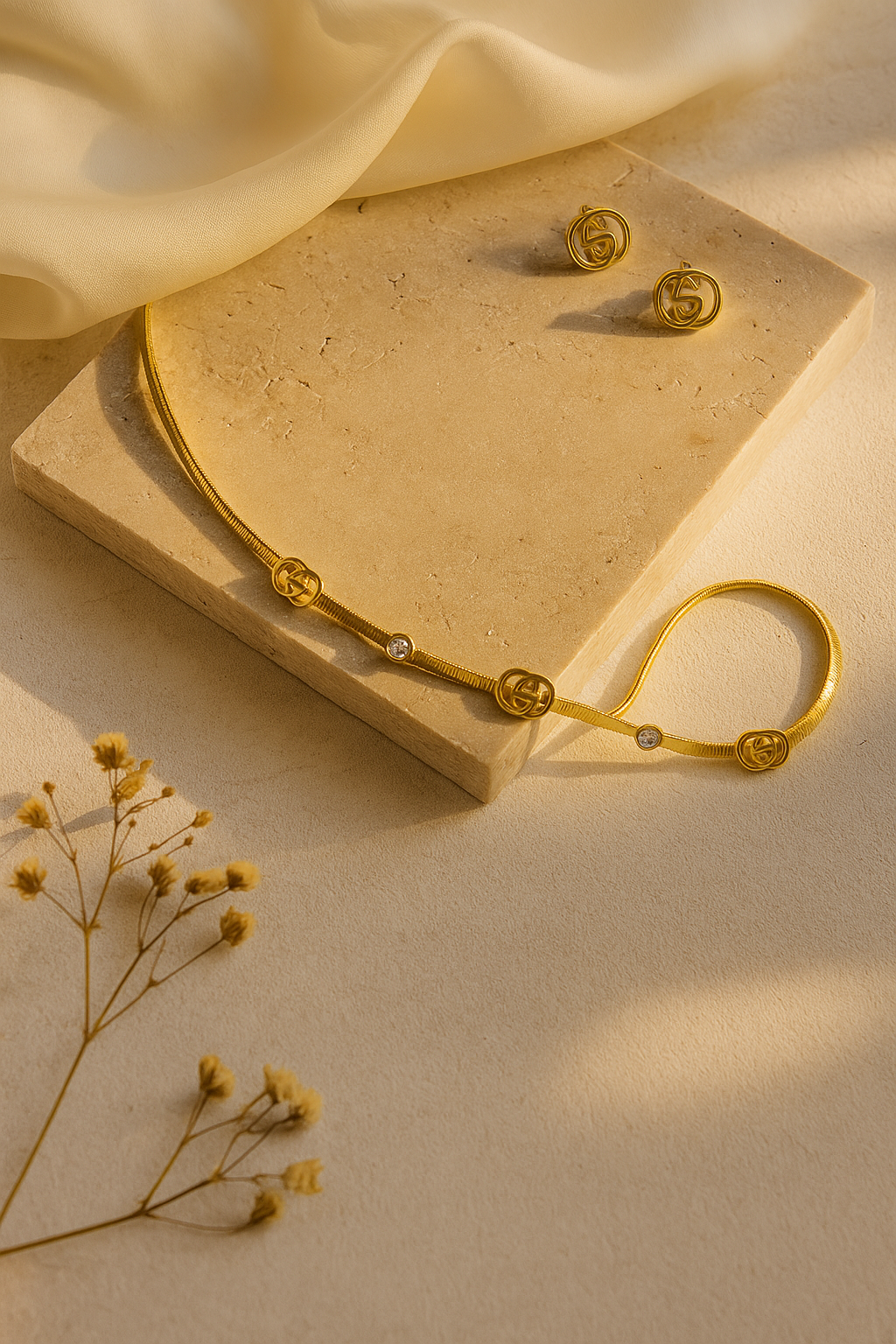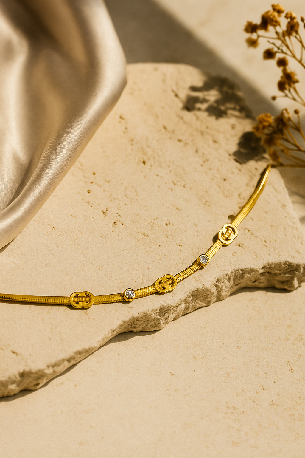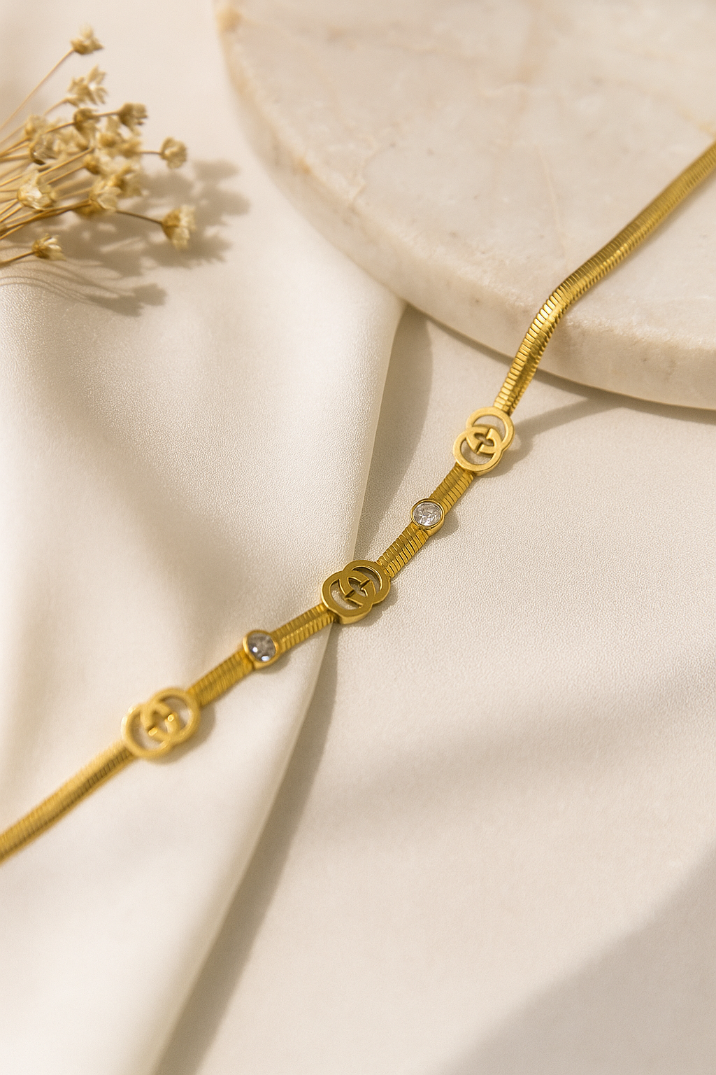 Radiating sophistication, Bella features a sleek gold-toned chain accented with interlocking charms and sparkling stones. Its minimal yet luxurious design makes it perfect for everyday elegance or a refined evening look.