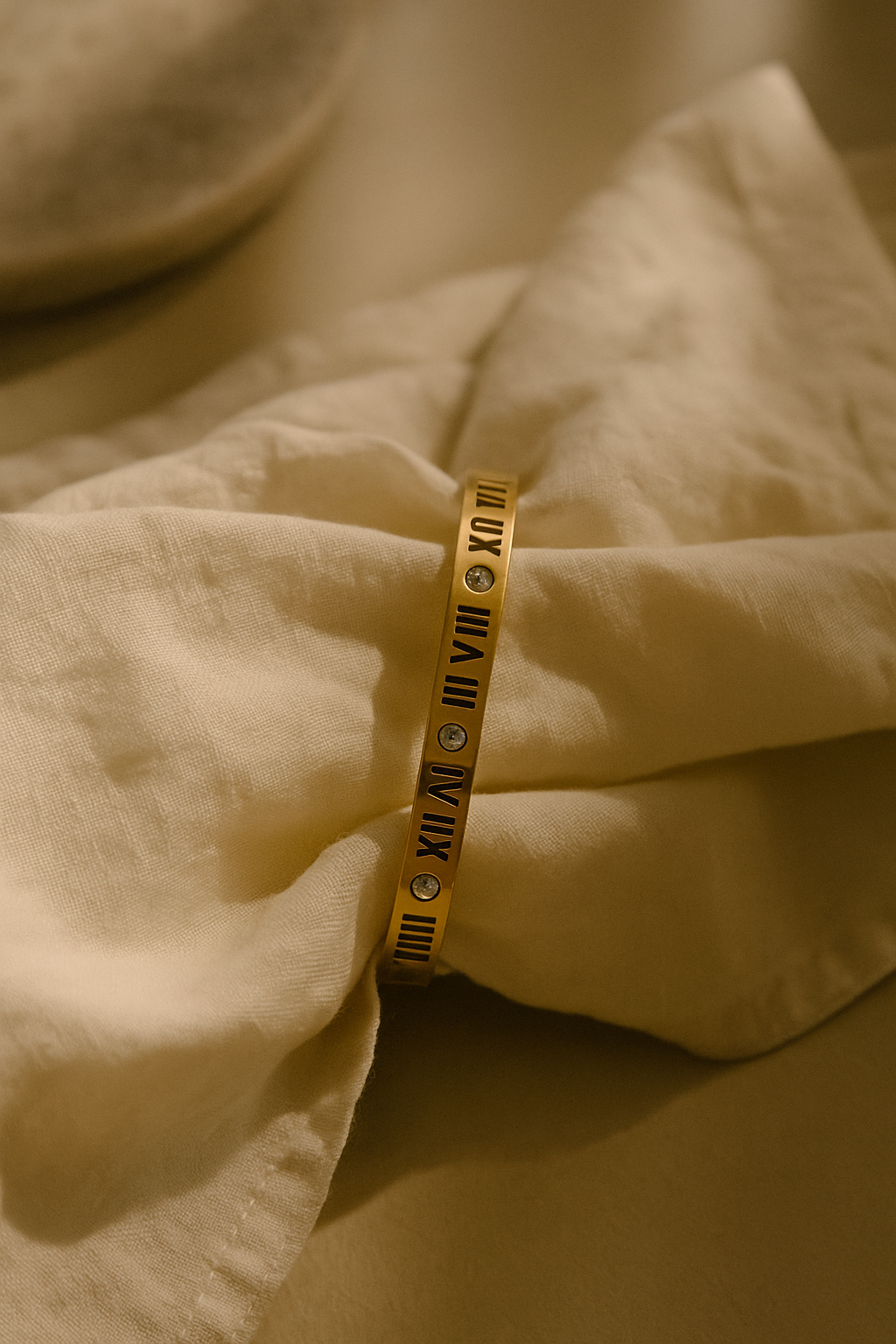 The Eternal Roman Gold Bracelet is a stunning fusion of classic artistry and modern elegance. Crafted in radiant gold-tone metal, it features beautifully engraved Roman numerals that symbolize timelessness and sophistication. Interspersed with shimmering crystal accents, each detail reflects a perfect balance of luxury and minimalism. Designed for versatility, this bracelet complements both casual and formal outfits, making it an essential piece for any jewelry collection.