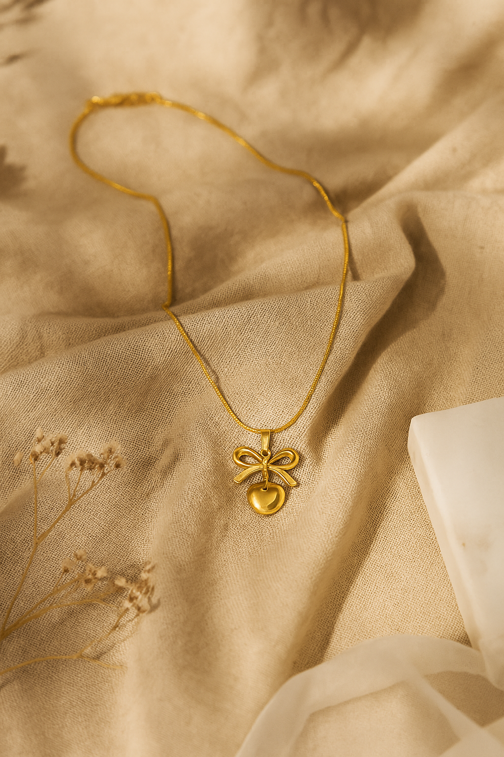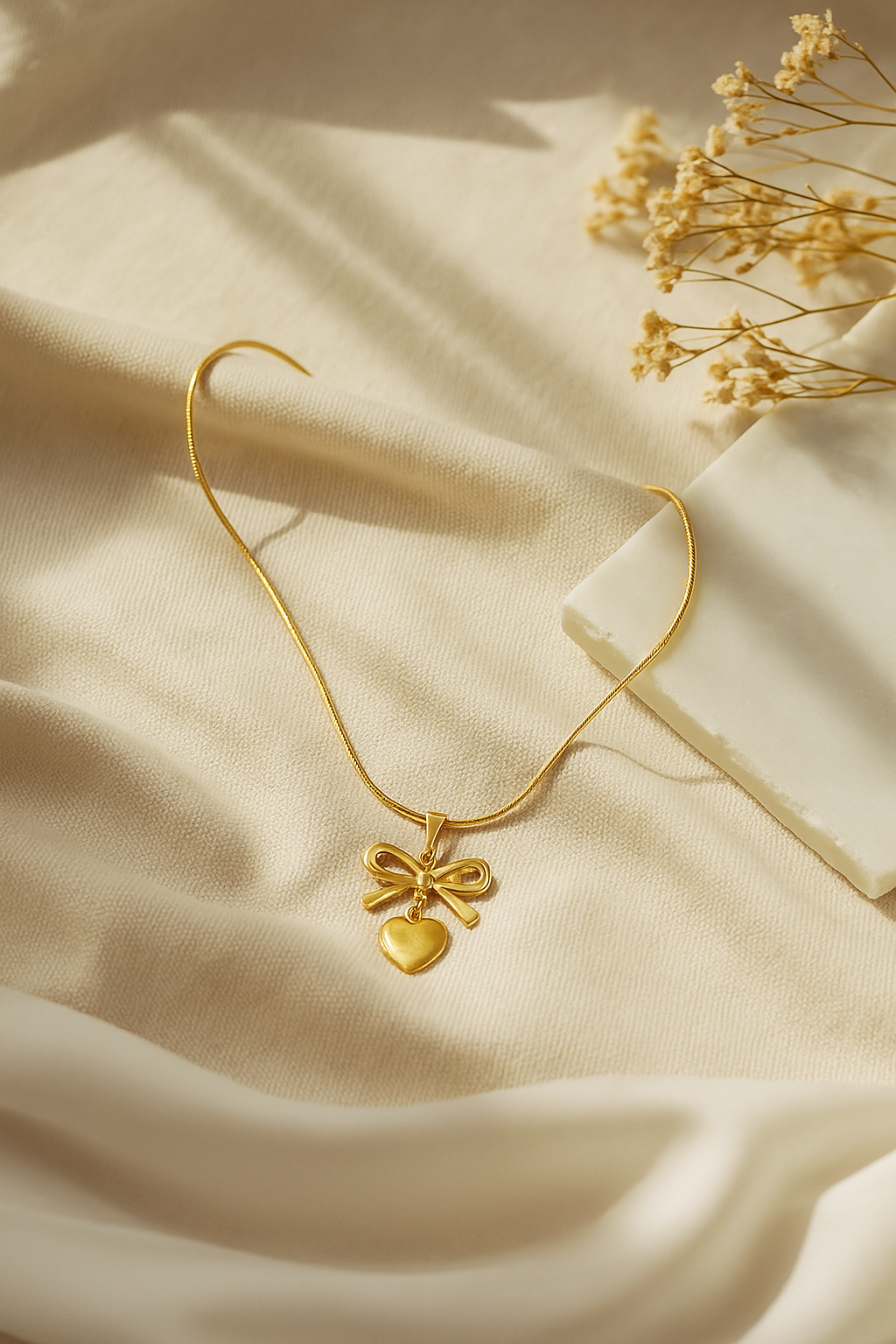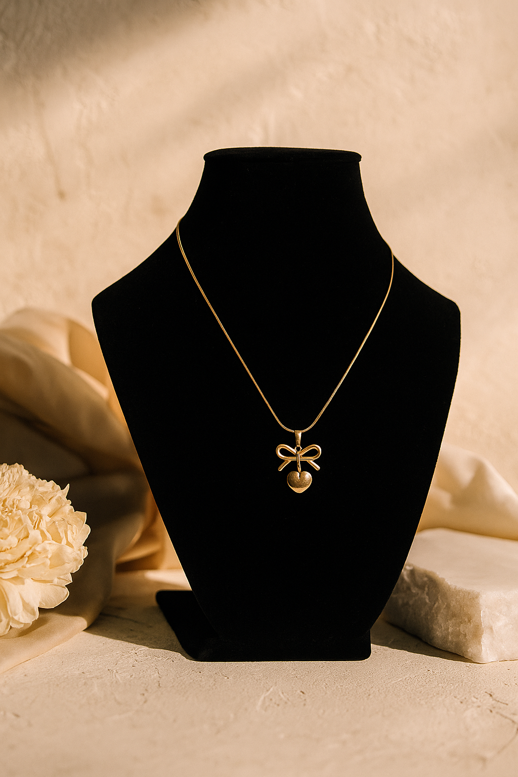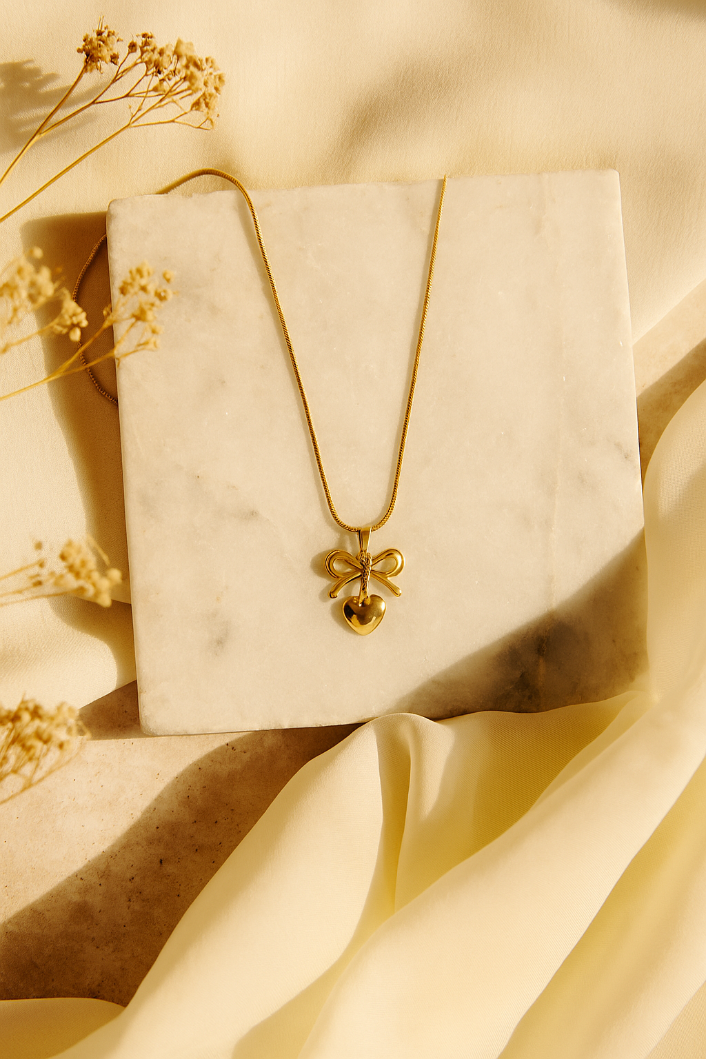 Delicate and romantic, Amoura features a graceful bow holding a polished heart charm, symbolizing love and affection. Crafted with a sleek gold-tone finish, this elegant necklace is perfect for adding a touch of sweetness to any outfit.