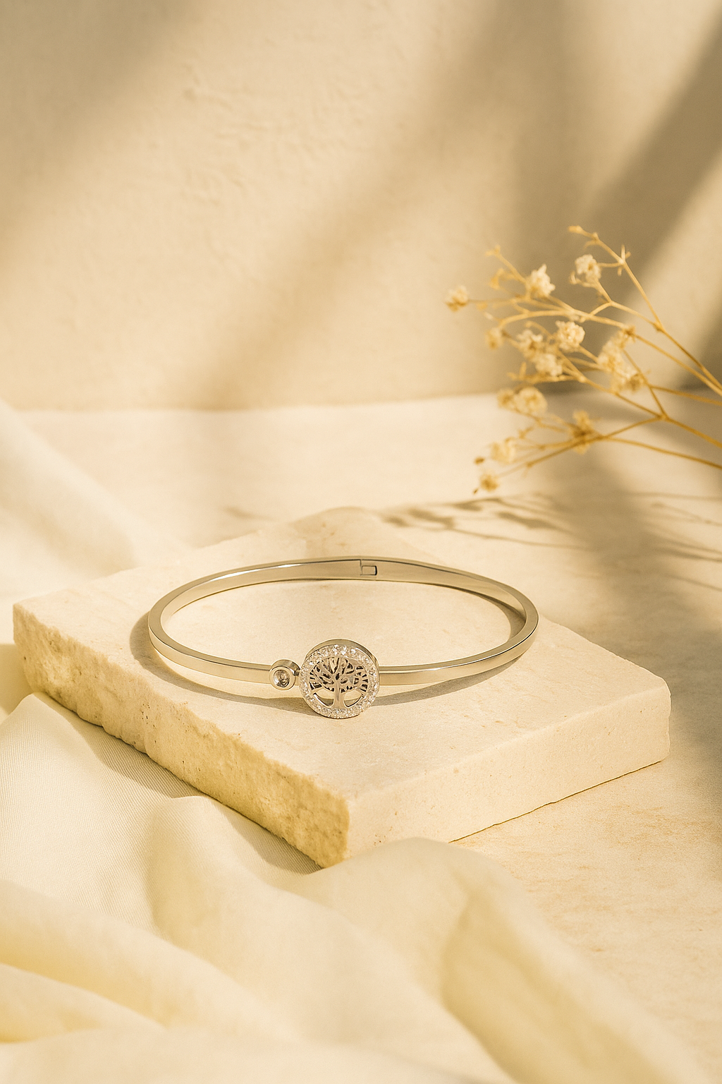 Eterna a symbol of growth, strength, and new beginnings, this sleek silver bracelet features a beautifully detailed Tree of Life charm adorned with sparkling accents. Its minimalist open bangle design adds a modern touch, making it a perfect piece for everyday elegance or meaningful gifting.