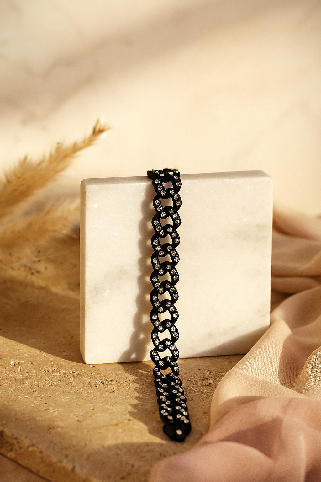 Make a bold statement with Wavy, a striking black chain bracelet adorned with shimmering crystals. Its unique interlinked design blends edgy style with elegant sparkle, perfect for elevating any look day or night.