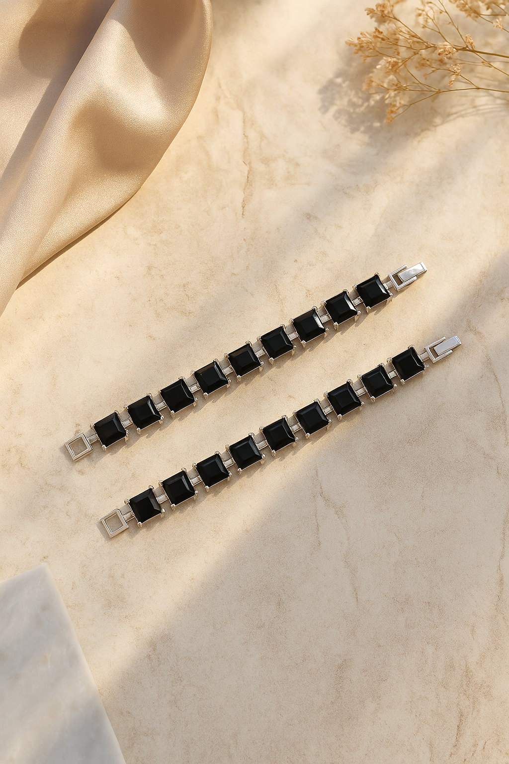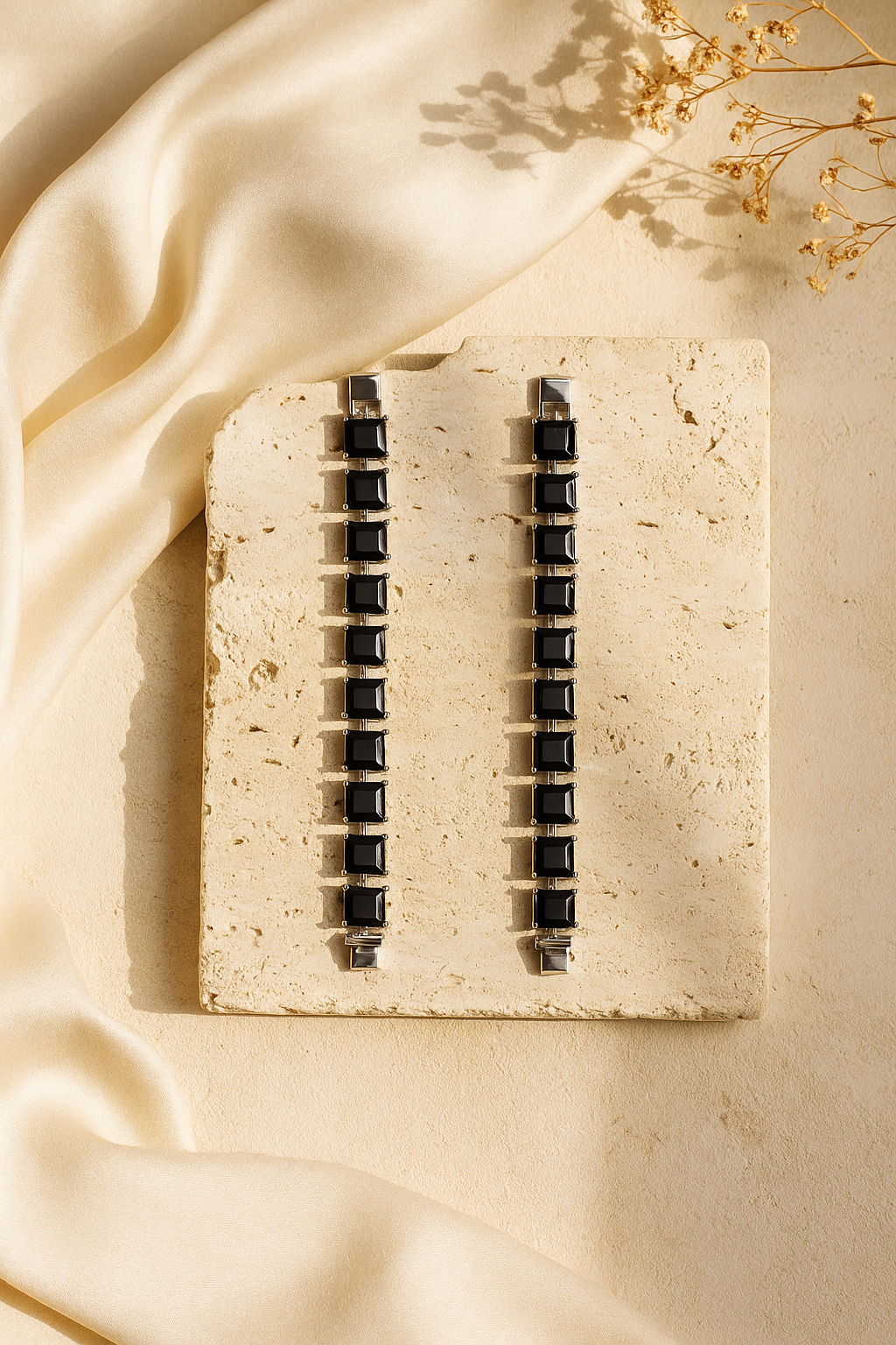 Modern and bold, Mira features a series of polished black stones set in a sleek silver-toned frame. Its geometric design creates a statement look that’s perfect for adding an edge of sophistication to any outfit.