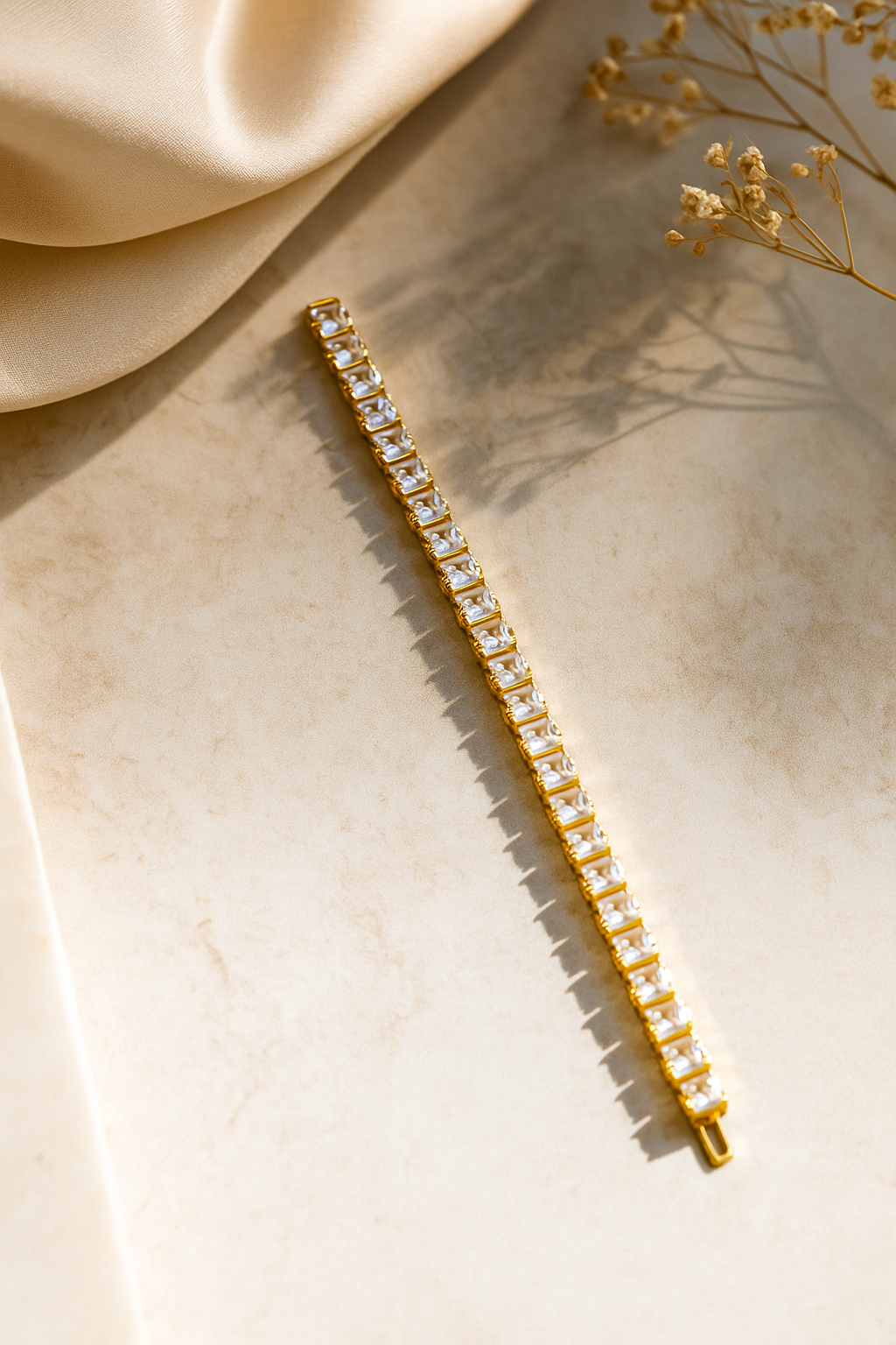 Radiate brilliance with Lustro, a classic gold tennis bracelet adorned with a continuous line of sparkling stones. Designed for timeless elegance, this piece transitions effortlessly from day to night, adding just the right touch of luxury to your look.