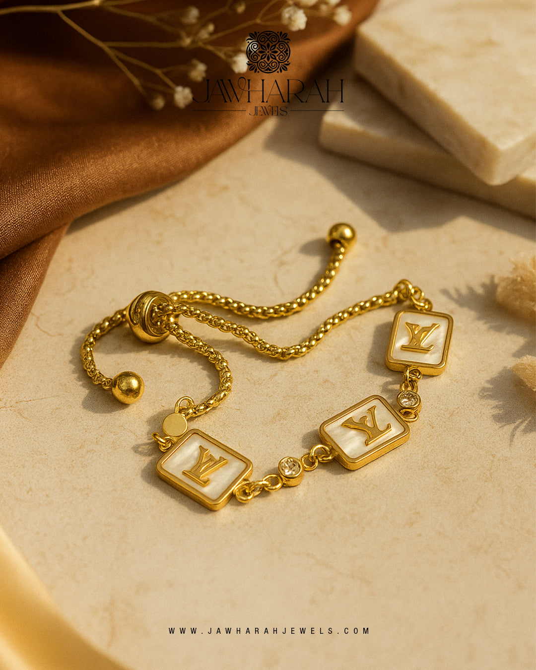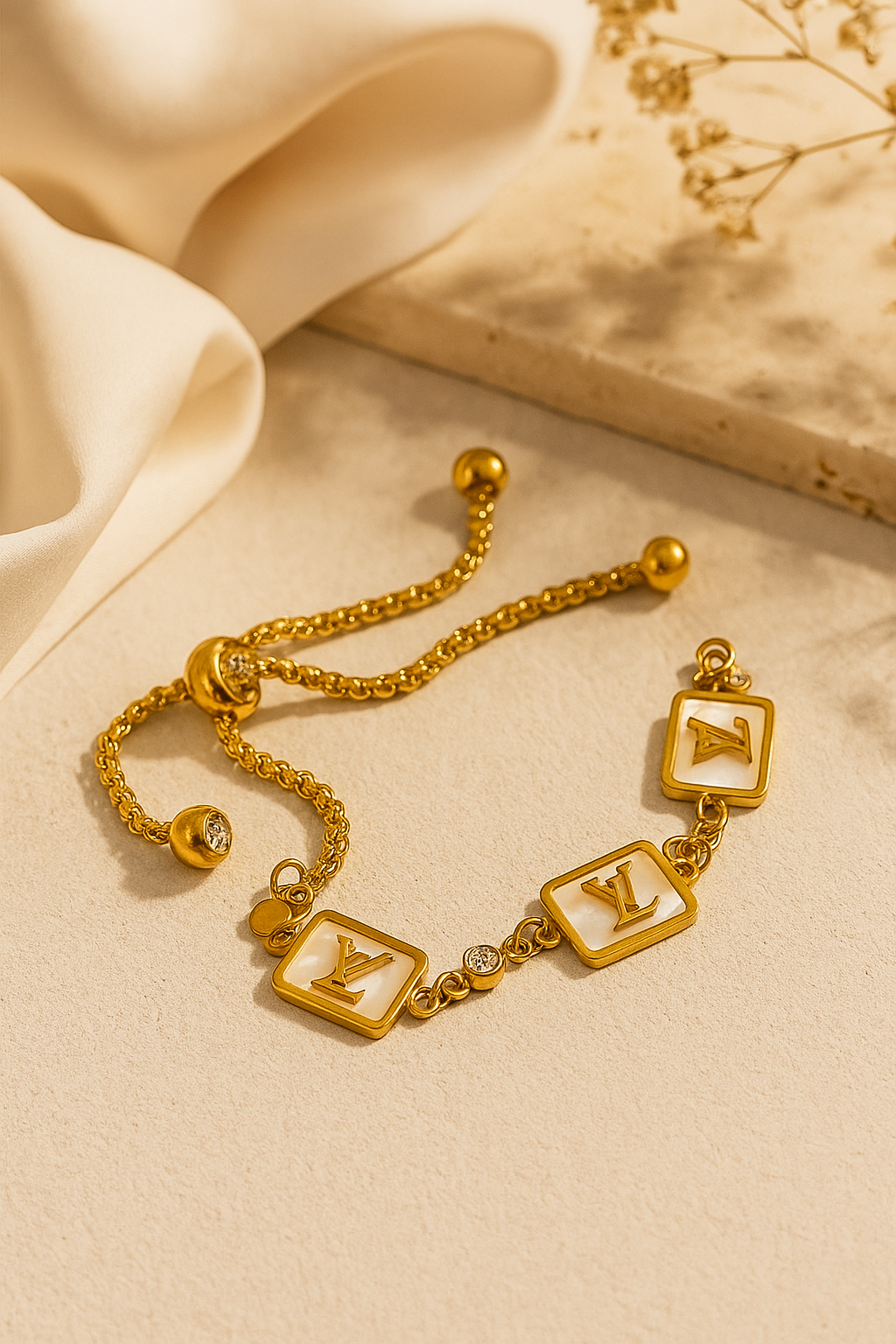 A statement of timeless elegance, the Icona bracelet pairs lustrous mother of pearl inlay with polished gold tiles, accented by delicate crystal details. Its adjustable chain ensures a perfect fit, while the refined design makes it a versatile piece for both everyday wear and elevated occasions.