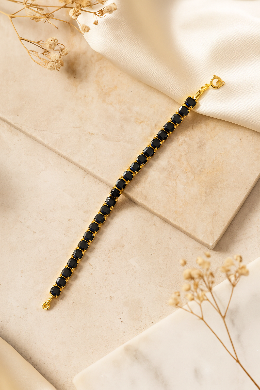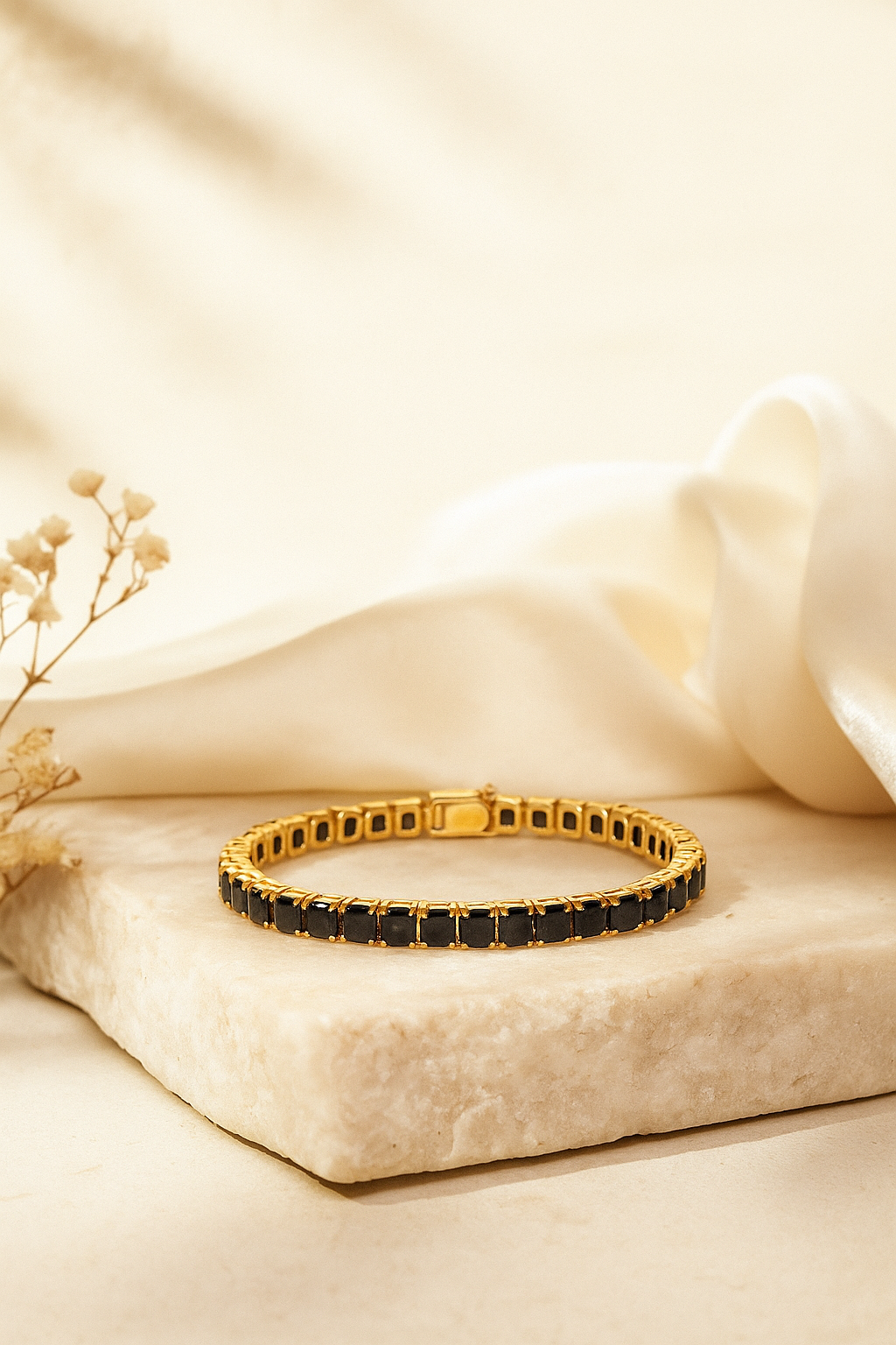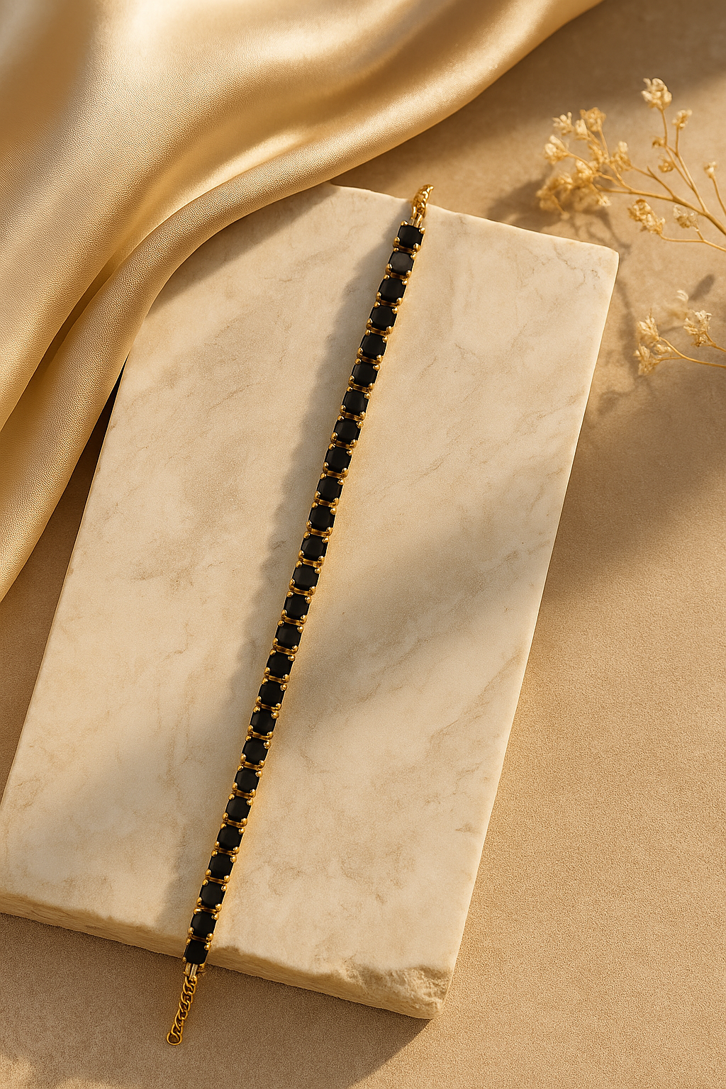 A timeless bracelet that embodies sophistication, the Noir Luxe features a seamless row of deep black onyx stones, elegantly set in radiant gold. Its bold contrast of dark and light creates a striking balance of luxury and refinement, perfect for both everyday elegance and evening glamour.