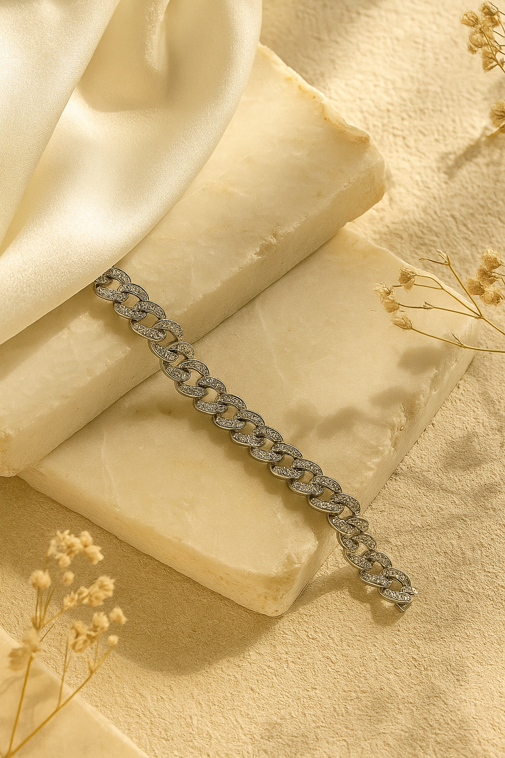 Make a bold statement with Wavy, a striking silver chain bracelet adorned with shimmering crystals. Its unique interlinked design blends edgy style with elegant sparkle, perfect for elevating any look day or night.
